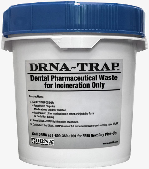 DRNA’s 1.25 gallon Pharmaceutical Kit meets EPA requirements and safely disposes of anesthetic carpules, medication used for sedation, aspirin and other medications in tablet or injectable form, and IV sedation tubing.